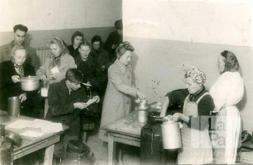 Piena sadales punkts Centrālajā nometnē Vircburgā (amerikāņu zonā). Priekšplānā ir divi galdi, pie kuriem ir lielas piena kannas. Kreisajā pusē stāv cilvēku rinda, kas turpinās ap telpas stūri; viens vīrietis sēž pie galda un pēta dokumentus. Labajā pusē sieviete priekšautā smeļ no kannas pienu mazākā kannā.