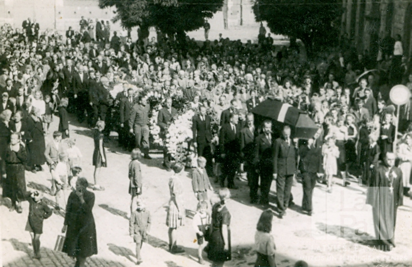 Bēru gājiens, apglabājot Centrālās nometnes Vircburgā (amerikāņu zonā) pirmo latviešu priekšnieku ? Neimani. Priekšplānā, labajā pusē, gājiena priekšgalā iet mācītājs amata tērpā, aiz viņa soļo zārka nesēji un pārējie gājiena dalībnieki. Apkārt ir sastājušies skatītāji.