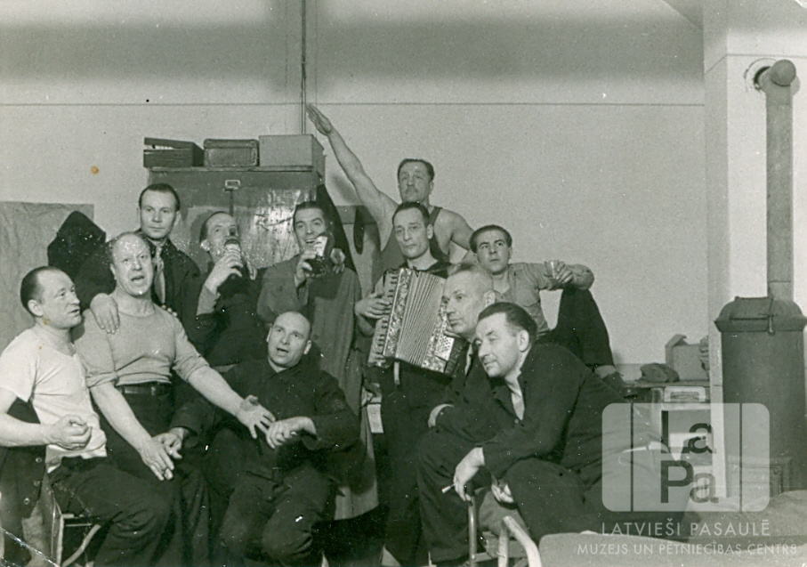 Armijas "melno" vienības karavīri savā istabā Centrālajā nometnē Vircburgā (amerikāņu zonā). Vīri dzied, viens spēlē akordeonu, diviem rokās ir dzērienu pudeles. Vairāki vīrieši ir ģērbušies tumšos formastērpos. Labajā telpas pusē ir apaļa metāla krāsns ar skursteni. Krāsns priekšā virietis sēž uz gultas. Aiz vīriem uz skapjaugšas ir divi koferi un kaste.