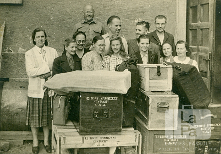 Sprodzēnu ģimene atvadās no draugiem Centrālajā nometnē Vircburgā (amerikāņu zonā), ģimenei izceļojot uz Kentuki, ASV. Cilvēku grupa divās rindās ēkas priekšā; labajā pusē ir atvērtas durvis. Priekšplānā ir sakrautas kastes un saiņi.