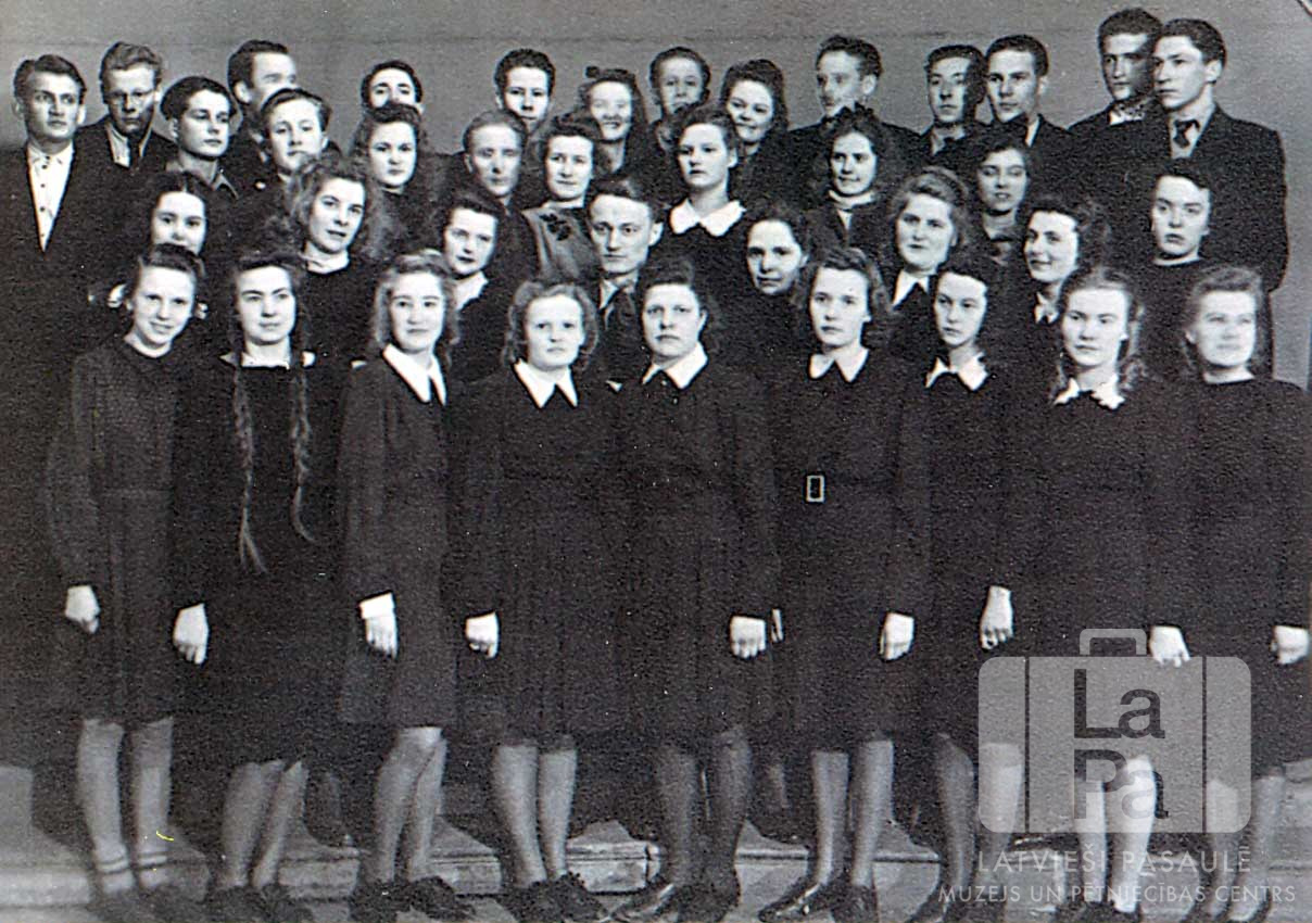 Ģimnāzijas jauktais koris ar diriģentu Centrālajā nometnē Vircburgā (amerikāņu zonā). Koristi tumšās drēbēs stāv četrās rindās. Pirmajā rindā, no kreisās: Aina Grīnberga, Elza Algere, Ilga Lazdiņa, Ilga Kaminska, Skaidrīte Nuškapa, Aija Bukaldere, Daila Dreziņa, Vēra Grauda un Inta Kļaviņa. Otrajā rindā, no kreisās: Dagmāra Paegle, Ivona Marve, Vija Boršteina, ? Āboliņš (diriģents) nezināms, Milda Kaspara, Dzidra Alsiņa un Karmena Kondrate. Trešajā rindā ir redzami: Alozijs Vaivars, Dzidra Resne, Velta Ārgale. Lidija Žubīte, Zigrīda Dankere un Irēne Sudmale. Ceturtajā rindā ir redzami: G. Ģermanis, S. Tukstens, Irēne Lizlova, Ingrīda Pļavniece, Antons Lavskis, Vilis Vējiņš un Guntis Kuškēvics.