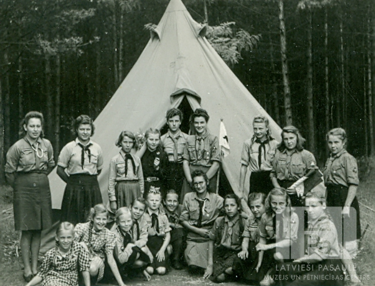 Amulas 6. gaidu vienība no Vircburgas Centrālās nometnes Vircburgā savā pirmajā gaidu nometnē 1946. gada vasarā, kas notika kalnā pie Ziemeļu nometnes Vircburgā (amerikāņu zonā). Gaidas formastērpos divās rindās pie telts. Fonā ir mežs.