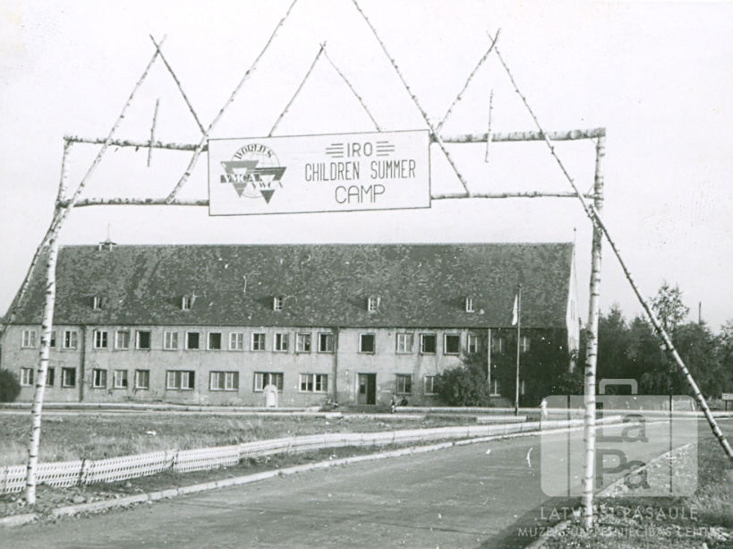 Bērza koka ieejas vārti organizācijas "YMCA" veidotā bērnu vasaras nometnē 1948. gada vasarā. Nometnē, kas notika pie Gībelštates ("Giebelstadt") kādreizējā lidlauka, piedalījās arī bērni no Centrālās nometnes Vircburgā (amerikāņu zonā). Uz zīmes vārtu augšā ir rakstīts: "IRO / CHILDREN SUMMER / CAMP". Aiz ieejas vārtiem ir biroja ēka – divstāvīga mūra celtne. Foto autors: Guntis Kuškēvics.
