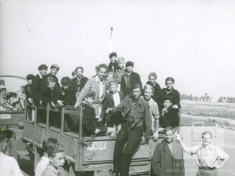 Zēni un vīrieši sēž smagajā kravas mašīnā, dodoties mājās no organizācijas "YMCA" veidotās bērnu vasaras nometnes 1948. gada vasarā. Nometnē, kas notika pie Gībelštates ("Giebelstadt") kādreizējā lidlauka, piedalījās arī bērni no Centrālās nometnes Vircburgā (amerikāņu zonā). Pie kravas mašīnas stāv citi jauni vīrieši; viens sēž uz kravas mašīnas aizmugures borta. Kreisajā pusē aiz automašīnas ir vēl viena smagā kravas mašīna ar pasažieriem. Fonā, labajā pusē, ir plašs laukums. Foto autors: Guntis Kuškēvics.