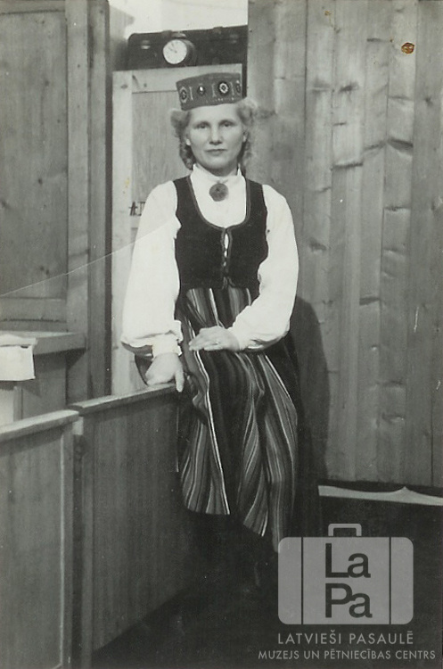 Milda Balodis aizlienētā tautastērpā sēž uz zemas koka sienas Kemptenes nometnē (amerikāņu zonā). Fonā ir telpas koka sienas.
