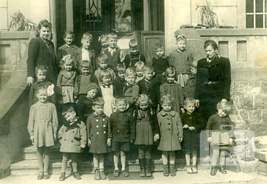 Bērnudārza bērni ar audzinātājām stāv uz mūra ēkas ieejaskāpnēm Giftenes nometnē (angļu zonā). Bērni stāv vairākās rindās, audzinātājas stāv uz kāpnēm katra savā pusē.