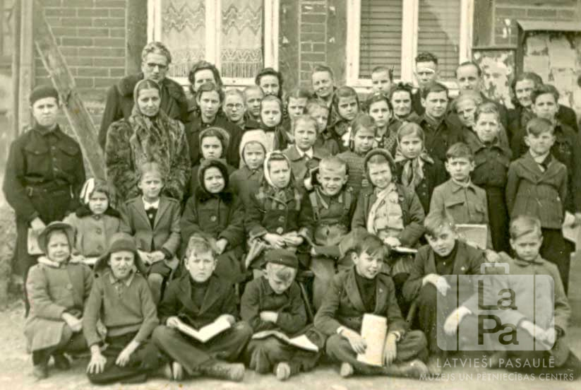 Pamatskolas skolēni un skolotāji Giftenes nometnē (angļu zonā). Cilvēku grupa vairākās rindās ķieģeļu ēkas logu priekšā. Pirmā rinda sēž uz zemes; vairākiem bērniem rokās ir atvērtas grāmatas.