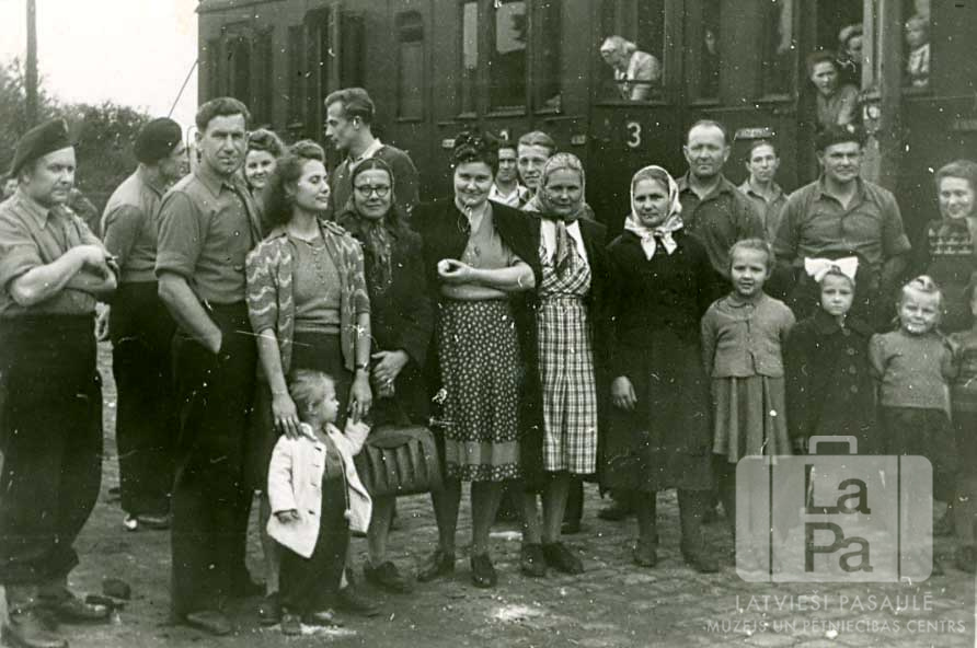 Cilvēki stāv pie vilciena, gaidot transportu, kas viņus aizvedīs no Eversburgas nometnes (angļu zonā) uz Lingenes nometni. Cilvēki vairākās rindās. Aizmugurē vilciena vagonā ir redzami cilvēki.