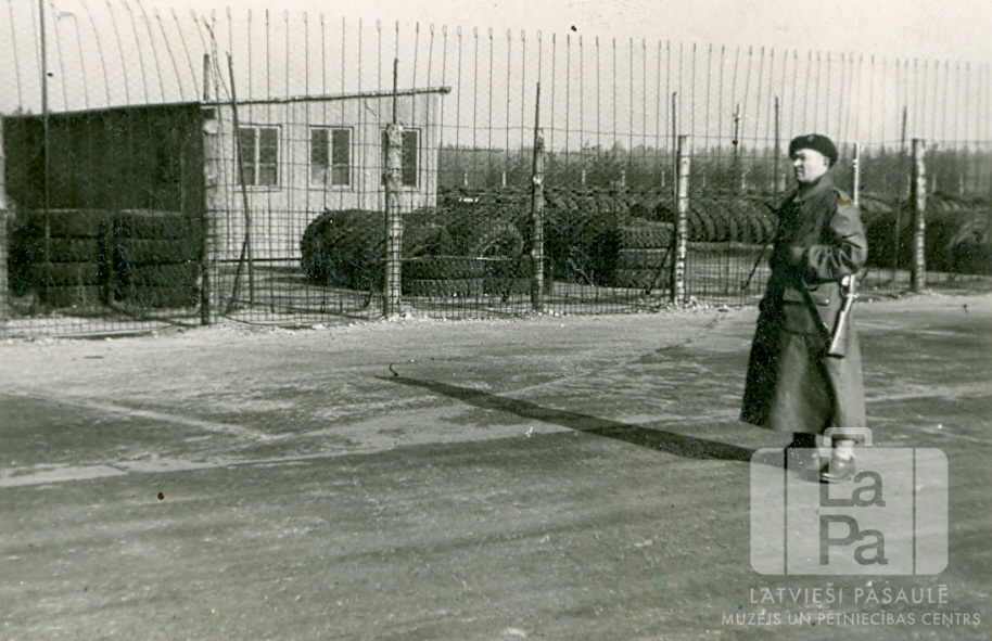 Sargs "melno" vienības formastērpā ar šauteni plecā stāv pie žoga Eversburgā (angļu zonā) 1948. gada rudenī. Aiz žoga ir zema būda un rindas ar sakrāmētām automašīnu riepām.