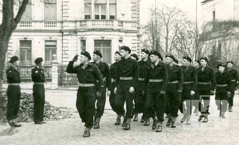 Vīri "melno" armijas vienības formastērpos soļo valsts svētku parādē Eversburgā (angļu zonā). Kreisajā pusē salutē divi citi vīri formastērpos. Priekšā ejošais vīrietis sveicienu atņem. Fonā ir mūra ēka aiz žoga.