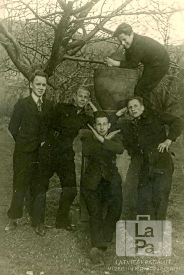 Pieci draugi pie pieminekļa Fērdenes nometnē (angļu zonā) 1950. gada ziemā. Četri jaunekļi stāv priekšā, aizmugurē viens jaunietis stāv uz pieminekļa, aptvēris tā augšdaļu ar rokām. Fonā ir koki bez lapām. Aizmugurē uz pieminekļa: Visvaldis Kupsis.