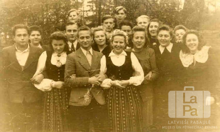 Rendsburgas latviešu skolas jaunieši Fokbekas nometnē Rendsburgā (angļu zonā) pirmajās Latvijas Valsts dzimšanas dienas svinībās pēc Otrā pasaules kara. Vairākas rindas; priekšējā rindā divas jaunietes ir ģērbušās tautastērpos. Fonā ir mežs. Pirmajā rindā, no kreisās: pirmais Bruno Ronis, otrā Zenta Krūmiņa, trešais Laimonis Mangulis, ceturtā ? Veidenberga (skolas direktore), sestā Ataudziņa Bankoviča (pr. Rita Drone).