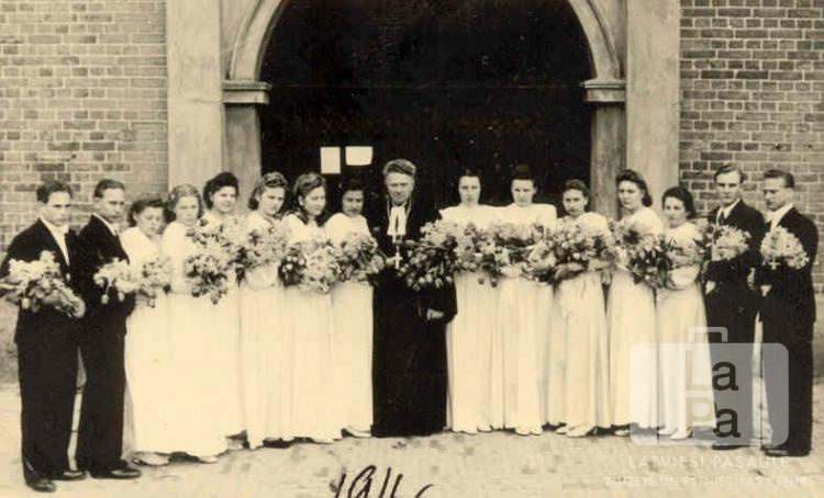 Jaunieši no Fokbekas nometnes Rendsburgā (angļu zonā) pēc iesvētībām pilsētas luterāņu baznīcā. Jaunieši kleitās un uzvalkos stāv ar mācītāju vidū baznīcas ieejas priekšā. No kreisās: devītais A. Grīnbergs (mācītājs amata tērpā), trīspadsmitā Ataudziņa Bankoviča (pr. Rita Drone), četrpadsmitā Astrīda Kociņa, piecpadsmitais Alnis Bankovičs un sešpadsmitais Laimonis Mangulis.