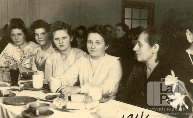 Jaunietes sēž pie kopēja iesvētību mielasta galda Fokbekas nometnē Rendsburgā (angļu zonā). Uz galda ir šķīvji, krūzes un trauki ar ēdienu, kā arī ziedi vāzēs. Blakus četrām jaunietēm gaišās kleitās labajā pusē sēž sieviete tumšā tērpā. Fonā sēž citi mielasta apmeklētāji. Priekšplānā, no kreisās: pirmā Ataudziņa Bankoviča (pr. Rita Drone), otrā Jautrīte Turka, ceturtā Astrīda Kociņa un piektā ? Kociņa.