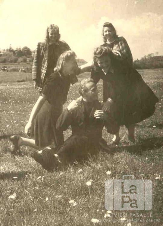 Latviešu ģimnāzijas 4. klases jaunieši no Frīdrihsortas nometnes Ķīlē (angļu zonā) pļavā skolas izbraukuma laikā 1947. gada vasarā. Četras jaunietes apkārt vienam jauneklim. Fonā kreisajā pusē ganās divas govis; tālumā mežs. No kreisās: Ligita ?, Ataudziņa Bankoviča (pr. Rita Drone), Laimonis Mangulis, Vija Tillere un Aira Nodieva.