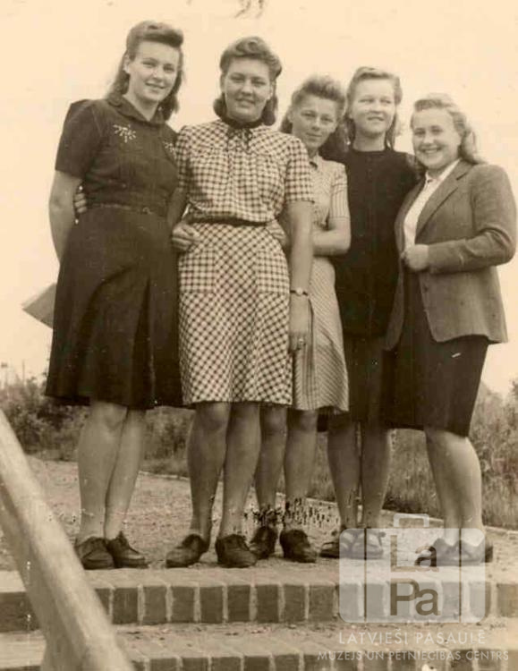 Piecas Frīdrihsortas nometnes Ķīlē (angļu zonā) latviešu ģimnāzijas internāta istabas biedrenes stāv uz takas ķieģeļu kāpņu augšgalā. No kreisās: Zenta Krūmiņa, Ataudziņa Bankoviča (pr. Rita Drone), Ārija Galviņa, Aina Ābola un Ilona Skreija.