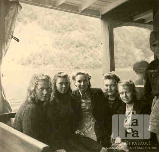 Piecas jaunietes no latviešu ģimnāzijas Frīdrihsortas nometnē Ķīlē (angļu zonā) ekskursijas braucienā ar nelielu kuģi pa Kēnigszē ezeru ("Königsee"). Jaunietes sēž uz sola. Labajā pusē daļēji ir redzams vīrietis formastērpā. Fonā ir redzams apaudzis ezera krasts. No kreisās: pirmā Ligita ?, otrā Anna Blūmberga, trešā Maija Prauliņa, ceturtā Ataudziņa Bankoviča (pr. Rita Drone) un piektā Rūta Prauliņa.
