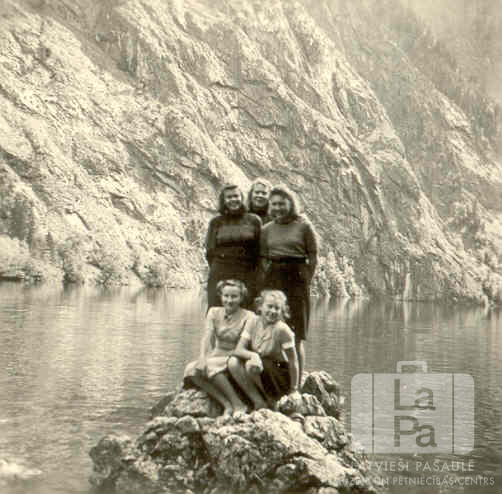 Piecas jaunietes no latviešu ģimnāzijas Frīdrihsortas nometnē Ķīlē (angļu zonā) pēc brokastīm uz klints bluķa Oberzē ezera ("Obersee) malā. Priekšā divas jaunietes sēž, aizmugurē trīs jaunietes stāv kājās. Fonā ir klintis otrā ezera krastā. Priekšā, no kreisās: Maija Prauliņa un Rūta Prauliņa. Aizmugurē, no kreisās: Anna Blūmberga, Ligita ? un Ataudziņa Bankoviča (pr. Rita Drone). Par šo gadījumu Rita Drone (dz. Bankoviča) stāsta: "Grupa meitenes no Ķīles Fridriksortas DP nometnes ģimnāzijas vasaras brīvdienās, "izšmaukušas” cauri okupācijas zonu robežām, pabija kādu nedēļu skaistā Garmišpartenkirchenas apkārtnē Vācijas dienvidos."