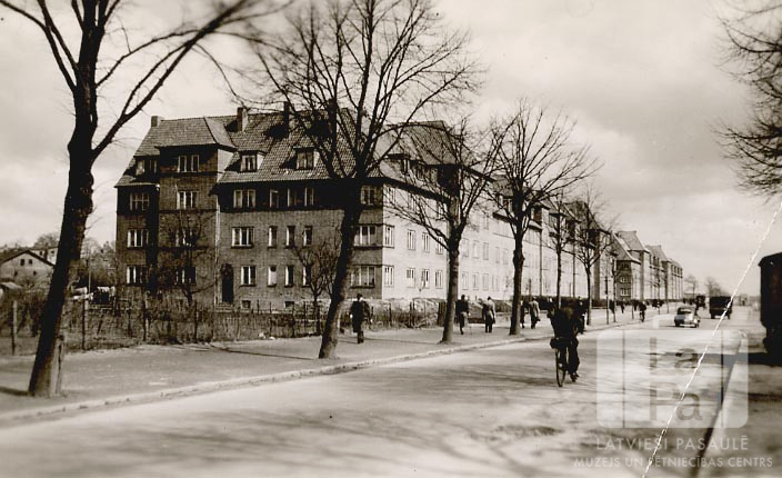 Iela ar ēkām un cilvēkiem Valderzē nometnē Lībekā (angļu zonā). Pa ielu brauc riteņbraucēji un automašīnas. Ielu no ietvi kreisajā pusē sadala koku rinda bez lapām. Pa ietvi pastaigājas cilvēki. Aiz ietves ir vairākas četrstāvu mūra ēkas.