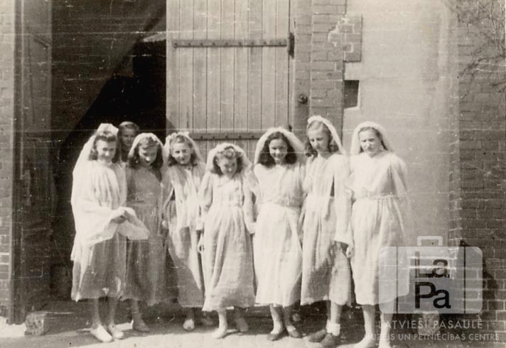 Astoņas jaunietes gaišos tērpos stāv pie ķieģeļu ēkas lielām koka durvīm Lībekā (angļu zonā). Jaunietes Annas Brigaderes pasaku lugā “Maija un Paija” tēloja mākoņsievas. Lugu iestudēja latviešu skolā.