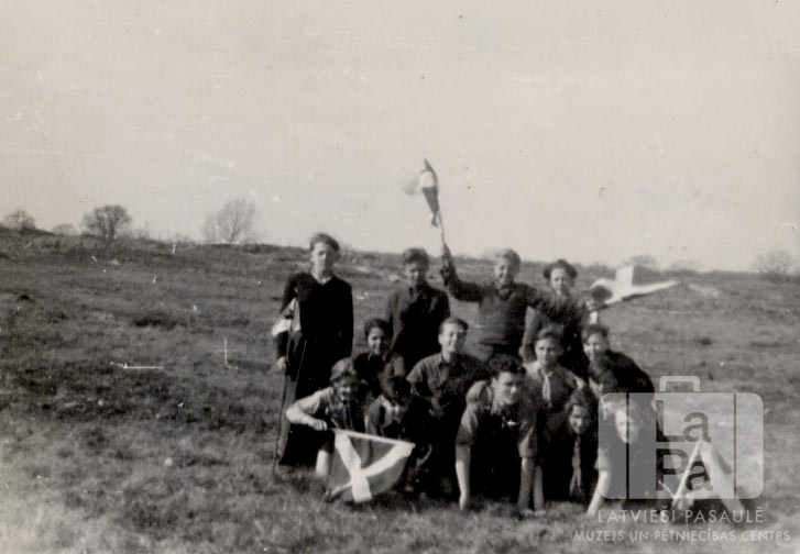 Skautu grupa ar karogiem klajumā Lībekā (angļu zonā). Jaunieši vairākās rindās. Uz karogiem ir gaišs krusts. Pirmajā rindā, pirmais no labās: Imants Sulainis.