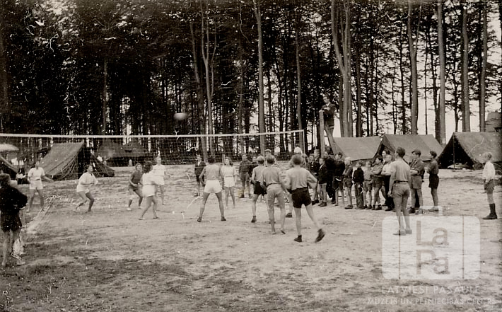 Jaunieši no Lībekas (angļu zonā) spēlē volejbolu organizācijas "YMCA" nometnē Timmendorfā. Bumba lido pāri volejbola tīklam, abās pusēs stāv komandas. Malā stāv skatītāji. Fonā meža malā ir uzslietas teltis.