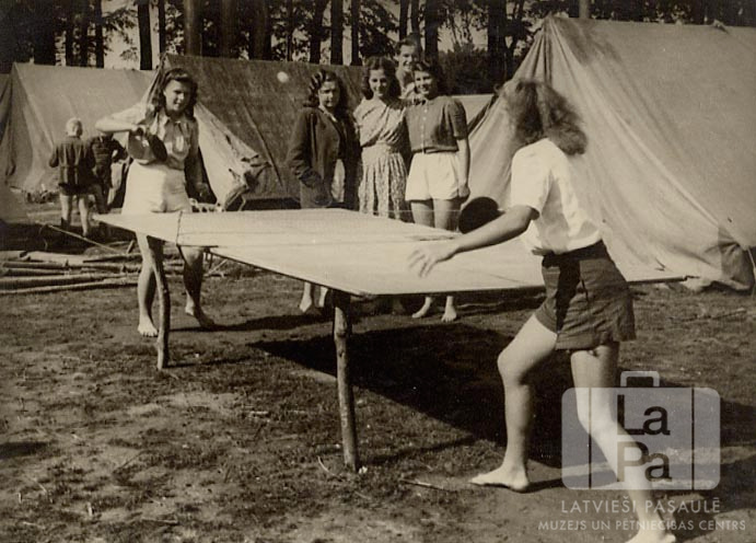 Divas jaunietes no Lībekas (angļu zonā) spēlē galda tenisu organizācijas "YMCA" nometnē Timmendorfā. Aizmugurē četri jaunieši vēro spēli. Fonā ir uzslietu telšu rinda meža malā.