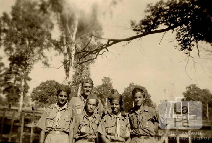 Pieci skauti formastērpos stāv pie zema koka redeļu žoga Miera džamborejā Francijā. Tajā piedalījās arī skauti no Lībekas (angļu zonā). Fonā ir lauks ar atsevišķiem kokiem. No kreisās: otrais Arnis Zēbergs, trešais Kārlis Riekstiņš, piektais Linards Lukss.