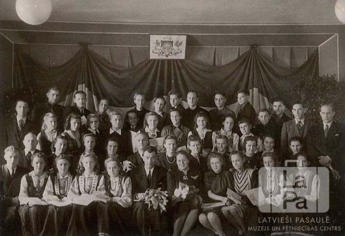 Skolēni un skolotāji pamatskolas izlaidumā Mēsenes nometnē Lībekā (angļu zonā). Vairākas jaunietes ir ģērbušās tautastērpos. Fonā pie sienas ir liels Latvijas karogs un mazs Latvijas ģerbonis. Pirmajā rindā, no kreisās: pirmais ? Bunķis (skolotājs), ceturtā Līga Drulle, piektā Edīte Balode, sestais ? Trokss (ar puķēm) un septītā ? Izande, astotā Ārija Lapse, desmitā Ina Jansone un vienpadsmitā Ausma Tolēna. Otrajā rindā, no kreisās: trešā ? Delle (skolotāja), ceturtā ? Abermanis (skolotāja), sestā ? Medenieks (skolotāja), astotā Biruta Bērziņa (skolotāja), devītā ? Timmermanis (skolotāja) un desmitā Līvija Puķe. Trešajā rindā, no kreisās: pirmais Arnolds Brīvulis (skolotājs), ceturtā Nora Jurēviča, sestais Vilnis Matisons, astotā Māra Dickale, devītā Rita Rozenberga, desmitā Vita Skulte, vienpadsmitā Marija Jesčenko, četrpadsmitais Delle. Pēdējā rindā, no kreisās: pirmais Ilmārs Krūtainis, otrais Arnis Mikus, ceturtais Ēriks Čūls, piektais Arnis Skangalis, sestais Rolands Neijs, astotais Edvarts Abermanis, devītais Līvis Dzelve un desmitais Arnis Zēbergs.