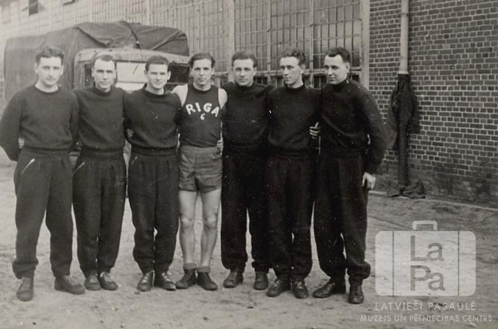 Vīriešu volejbola komanda Lībekā (angļu zonā). Seši jauni vīrieši stāv tumšos džemperos un biksēs; vidū stāv vīrietis šortos un kreklā ar uzrakstu "RIGA". Fonā ir smagā kravas automašīna pie ķieģeļu ēkas augstiem, rūtotiem logiem.