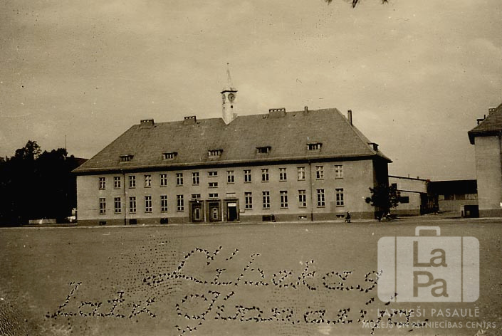Latviešu ģimnāzija Lībekā (angļu zonā). Divstāvu mūra ēka ar slīpu jumtu un mazu torni. Ēkas priekšā ir plašs laukums. Uz attēla apakšā ir rakstīts: "Lībekas / Latv. Gimnazija".