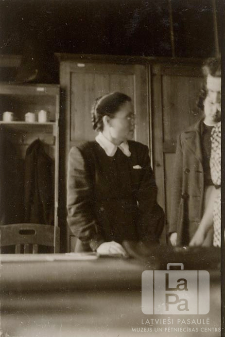 Latviešu ģimnāzijas angļu valodas skolotāja Lāmas jaunkundze Lībekā (angļu zonā). Sieviete ar brillēm profilā stāv aiz galda. Viņai labajā pusē stāv divi jaunieši. Aiz sievietes ir aizvērts koka skapis, kā arī skapis ar pakarinātām drēbēm.