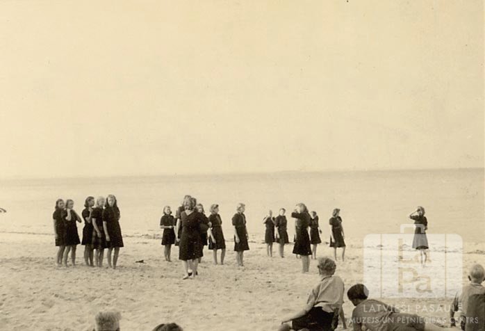 Gaidas formastērpos stāv jūras malā gaidu nometnē Timmendorfā pie Lībekas (angļu zonā). Priekšplānā viņas vēro zēni, ar mugurām pret fotogrāfu.