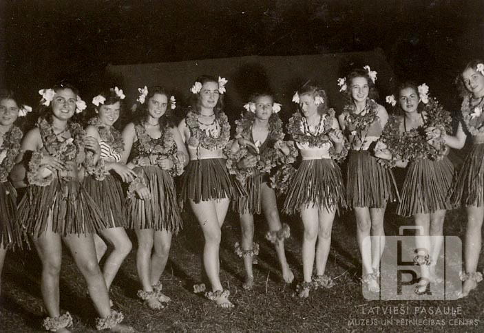 Jaunietes pašdarinātos tērpos organizācijas "YMCA" rīkotā nometnē Bēlerzē (angļu zonā). No zaļumiem veidoti svārki un matu virtenes ap kaklu, matos sasprausti ziedi.