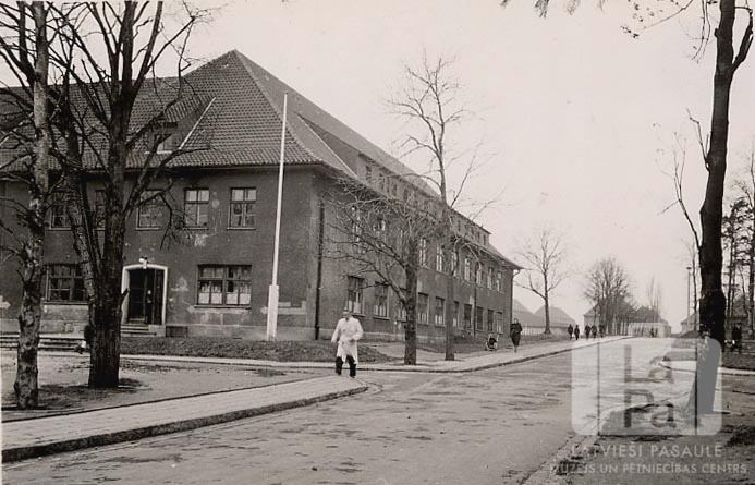 Latviešu ģimnāzija un meiteņu internāts Neištatē (Holšteinā, angļu zonā). Pie divstāvu mūra ēkas kreisajā pusē ir karoga masts. Priekšplānā ir ielas krustojums, pa ielu pastaigājas cilvēki. Ielas malās ir koku rindas bez lapām.