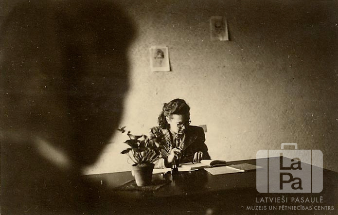 Matemātikas skolotāja ? Osvalda Neištatē (Holšteinā, angļu zonā). Sieviete pie galda lasa grāmatu, uz galda ir puķu pods. Priekšplānā ir vīrietis ar skatu pret skolotāju. Fonā pie sienas ir sievietes un vīrieša portreti; iespējams, Aspazija un Rainis.