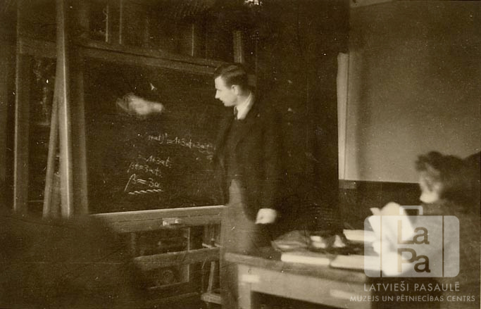 Skolotājs Pēteris Auziņš raksta uz tāfeles Neištatē (Holšteinā, angļu zonā). P. Auziņš ("Nazis") bija matemātikas (fizikas) skolotājs Neištatē un Lībekā. Priekšplānā, labajā pusē, solā sēž jauniete.