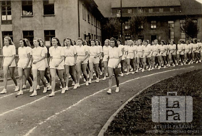 Sportistes soļo uz sporta svētkiem Neištates nometnē (Holšteinā, angļu zonā). Jaunietes gaišos sporta tērpos soļo četrās rindās pa stadiona skrejceļu ar iezīmētām līnijām uz zemes; labajā pusē atsevišķi soļo sieviete. Fonā ir divstāvu mūra ēka. Otrajā rindā, pirmā no labās: Maija Zariņa (pr. Grosc).