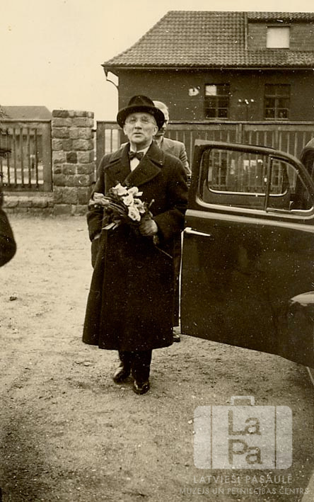 Latvijas Republikas sūtnis Lielbritānijā Kārlis Zariņš ar ziediem rokā stāv pie automašīnas savas vizītes laikā Neištatē (Holšteinā, angļu zonā). Vīrietis ir ģērbies tumšā mētelī, ar cepuri. Automašīnas durvis ir atvērtas. Aizmugurē aiz viņa stāv vīrietis. Fonā ir divstāvu mūra ēka ar žogu.