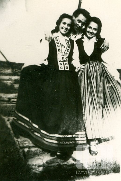 Trīs tautas deju grupas jaunieši stāv tautastērpos Fuldas nometnē (amerikāņu zonā). Priekšā stāv divas jaunietes, aizmugurē – jauneklis. Fonā, kreisajā pusē, iespējams, ir kāpnes. Priekšā, no kreisās: Robella Mazjāne un Ausma Buka. Aizmugurē stāv: Vilnis Bauers.