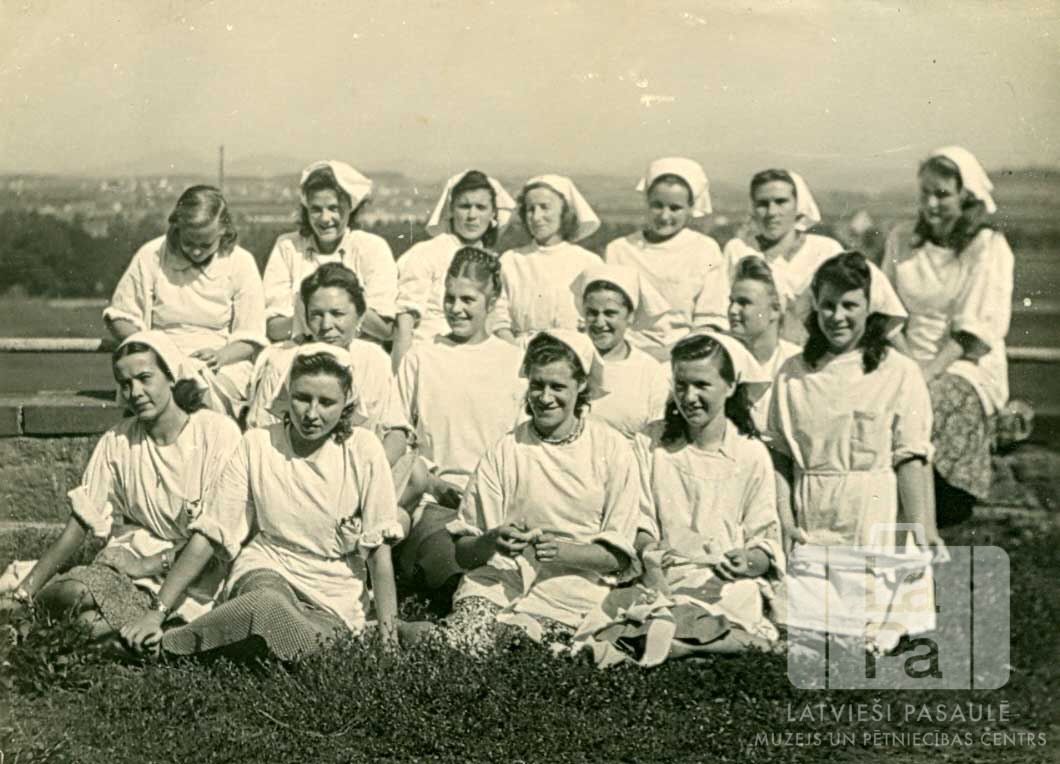 Palīgmāsu kursu dalībnieces uz trepēm. Kursos piedalījās arī jaunietes no Fuldas nometnes (amerikāņu zonā). Sieviets trijās rindās, fonā ir skats no augšas uz laukiem un apdzīvotu vietu tālumā. Pirmajā rindā, no kreisās: pirmā Robella Mazjāne un otrā Rūta Auniņa. Trešajā rindā, pirmā no labās: Ināra Medne.