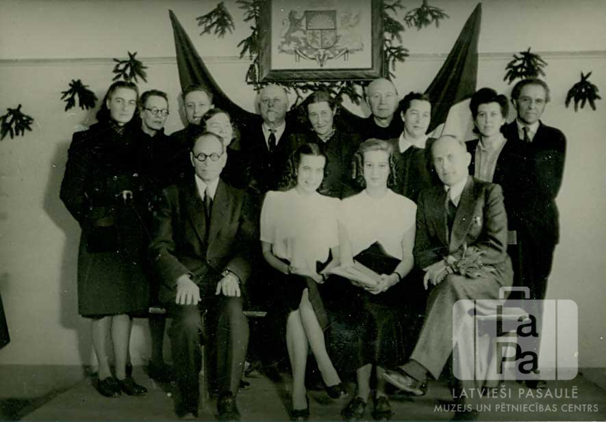 Ģimnāzijas absolventi un skolotāji Memmingenes nometnē (amerikāņu zonā). Priekšējā rinda sēž uz sola, aizmugurē rinda stāv kājās. Fonā pie sienas ir ierāmēts Latvijas ģerbonis, zem kura karājas Latvijas karogs. Priekšā, no kreisās: ? Gulbis (skolotājs), Robella Mazjāne, Jolanta Treiverta un ? Zīverts (mācītājs). Aizmugurē stāv, pirmais no labās: Roberts Mazjānis (skolotājs).