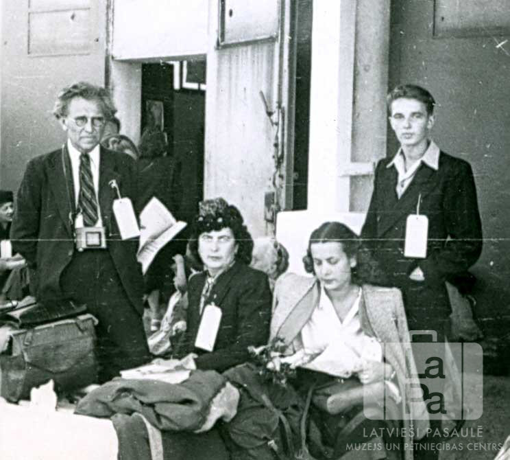 Mazjāņu ģimene gaida vilcienu Augsburgā (amerikāņu zonā), pirms došanās uz ASV. Tēvs, māte, meita un dēls, visiem pie apģērba ir gaišas izceļošanas birkas. Fonā pie ieejas ir redzami citi cilvēki. Priekšā, no kreisās: Roberts Mazjānis, Ella Mazjāne, Robella Mazjāne un Zintars Mazjānis.
