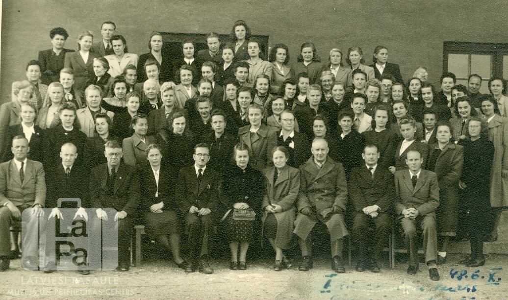 Kristīgās jaunatnes kursi Berhtesgādene (amerikāņu zonā). Liela cilvēku grupa vairākās rindās pie mūra ēkas, priekšējā rinda sēž uz krēsliem. Ceturtajā rindā, trešā no labās: Robella Mazjāne (ar tumšo kleitu); viņai blakus ir redzama Lidija Braunfelde. Uz fotogrāfijas apakšējā labā stūra ar zilu krāsu ir rakstīts daļēji nesalasāms teksts. Var salasīt: "48.6.X.". Par šo gadījumu Robella Lietapurs (dz. Mazjāne) stāsta: "Dīpīšu jauniešiem bija iespējas piedalīties kristīgās jaunatnes kursos."