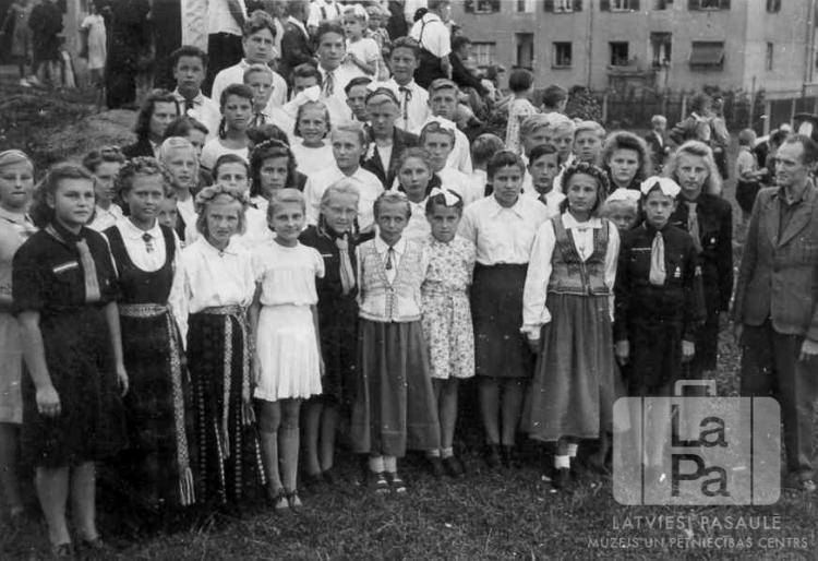 Bērnu svētku koris Hohfeldes nometnē Augsburgā (amerikāņu zonā). Bērnu grupa formastērpos un tautastērpos. Aizmugurē stāv citi cilvēki. Fonā labajā pusē ir nometnes mūra ēka.