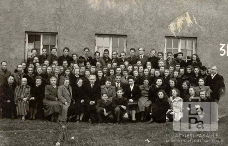 Ausekļa ģimnāzijas audzēkņi un skolotāji Hohfeldes nometnē Augsburgā (amerikāņu zonā). Liela cilvēku grupa vairākās rindās mūra ēkas logu priekšā. Labajā pusē uz sienas ir skaitlis "31".