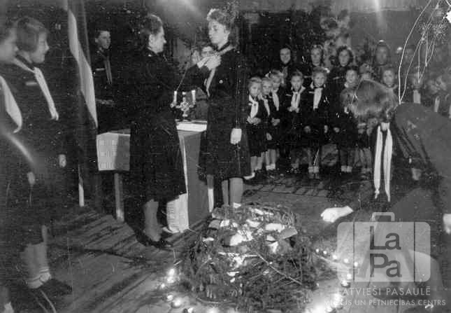 Gaidu vadītāja uzliek kaklautu savai meitai Raunas 78. gaidu vienības svinīgā solījuma laikā Hohfeldes nometnē Augsburgā (amerikāņu zonā). Apkārt stāv gaidas. Visas ir ģērbušās formastērpos. Priekšplānā uz zemes ir mākslīgs ugunskurs ar mazu sveču apli apkārt. Vidū, no kreisās: Anna Cubīna (gaidu vadītāja) un Inta Cubīna.