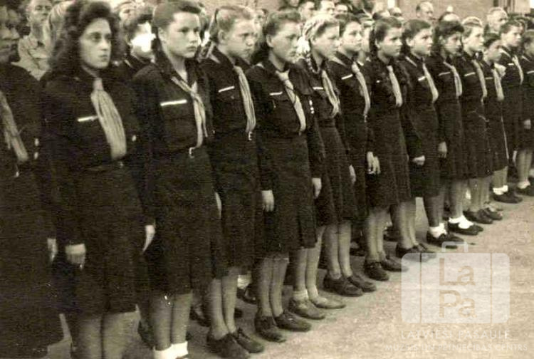 Raunas 78. gaidu vienība ierindā Hohfeldes nometnē Augsburgā (amerikāņu zonā). Jaunietes formastērpos stāv divās rindās. Aizmugurē, iespējams, stāv skatītāji. Priekšējā rindā, no kreisās: ? Staņa, Biruta Rone, Astrīda Bitīte, Inese Caune, Māra Ostrova, Gaida Eglīte, Maija Baumane, Ņīna Šnepste, Kaija Ozoliņa, Rūda Paegle (pr. Stūris) un Maija Eikstrēma (pr. Laiviņa).