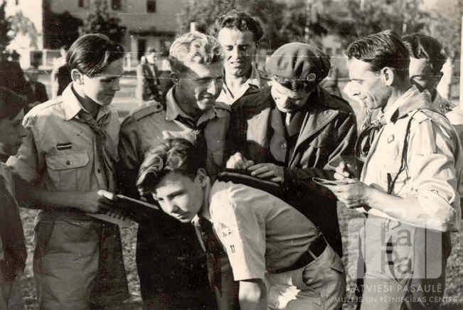 Raunas 81. skautu vienība no Hohfeldes nometnes Augsburgā (amerikāņu zonā) vāc piemiņas parakstus no ukraiņu skautiem 1946. gada vasarā. Viens puisis tumšā formastērpā parakstās, kā galdu izmantojot cita skauta muguru; apkārt viņam stāv puiši gaišos formastērpos. Aizmugurē, laukumā, pastaigājas cilvēki. Fonā ir mūra ēka. Priekšā ir redzams Iimants Pecholcs un Albīns Martinskis.