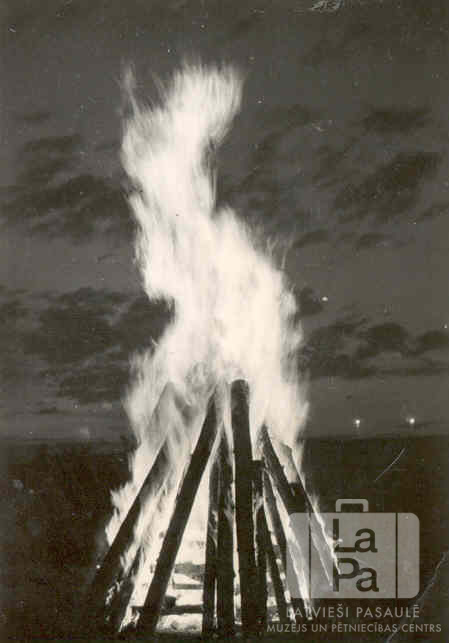 Liesmojošs ugunskurs Raunas 81. skautu vienības no Hohfeldes nometnes Augsburgā (amerikāņu zonā) ciemošanās beigās pie ukraiņu skautiem 1946. gada vasarā. Ugunskurs iekšienē ir veidots kā mājas/ piramīdas tipa, bet no ārpus sakrauts kā vigvamveida ugunskurs.
